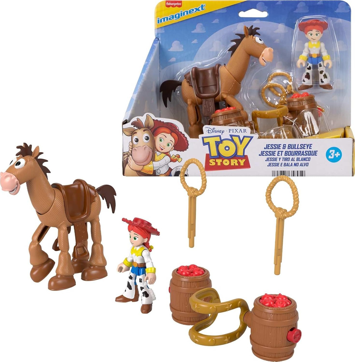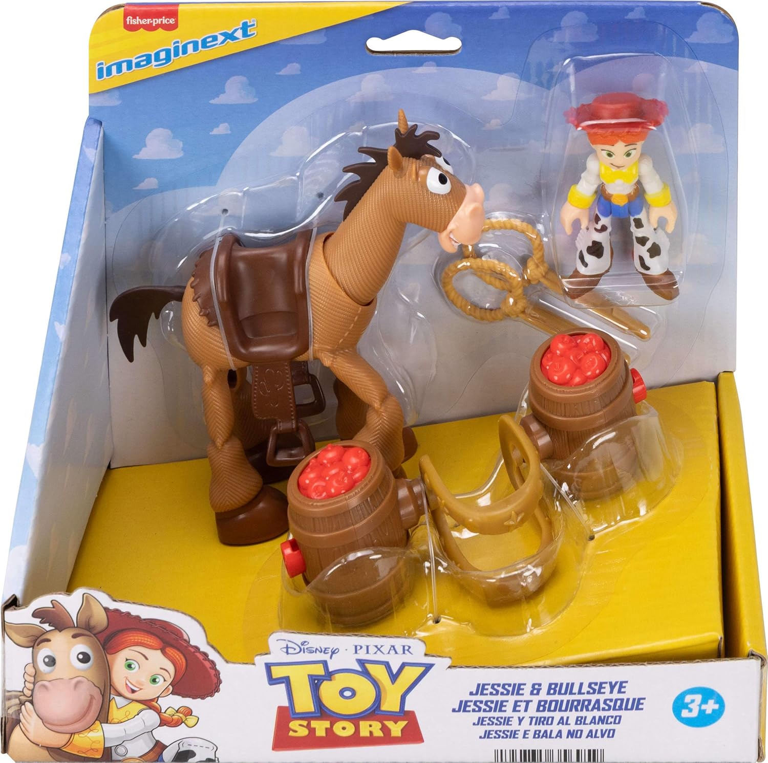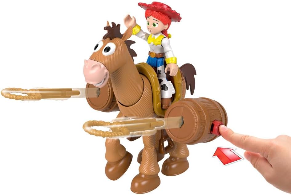 Jessie to jedna z głównych bohaterek bajki Toy Story, która stała się wybranką serca Chudego - dziewczyna podobnie jak on lubi kowbojski styl. Nosi szerokie spodnie w łatki, koszulę, kowbojskie buty i charakterystyczny kapelusz. Tym razem jej towarzyszem jest Mustang - koń, który należał do Chudego, jednak szybko zyskał sympatię Jessie. Mustang jest bardzo szybki i wytrzymały, ma przyjazne usposobienie i komunikuje się przez rżenie oraz mimikę pyszczka. Zestaw z serii Imaginext zawiera obydwie figurki, które wiernie oddają wygląd bajkowych bohaterów; w opakowaniu znaleźć można również dodatkowe akcesorium w postaci siodła z beczkami, pełniącymi funkcję wyrzutni! Czas rozpocząć wspaniałą zabawę z zabawkami Andy'ego.