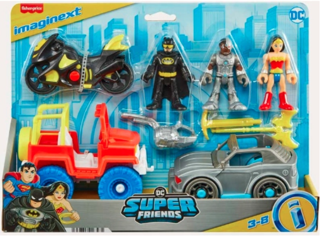 Superbohaterowie uniwersum DC są już gotowi, by wspólnie wyruszyć na zupełnie nowe akcje - opakowanie zestawu Imaginext skrywa 3 figurki, przedstawiające kolejno Batmana, Wonder Women oraz Cyborga, 3 pojazdy i 3 akcesoria.