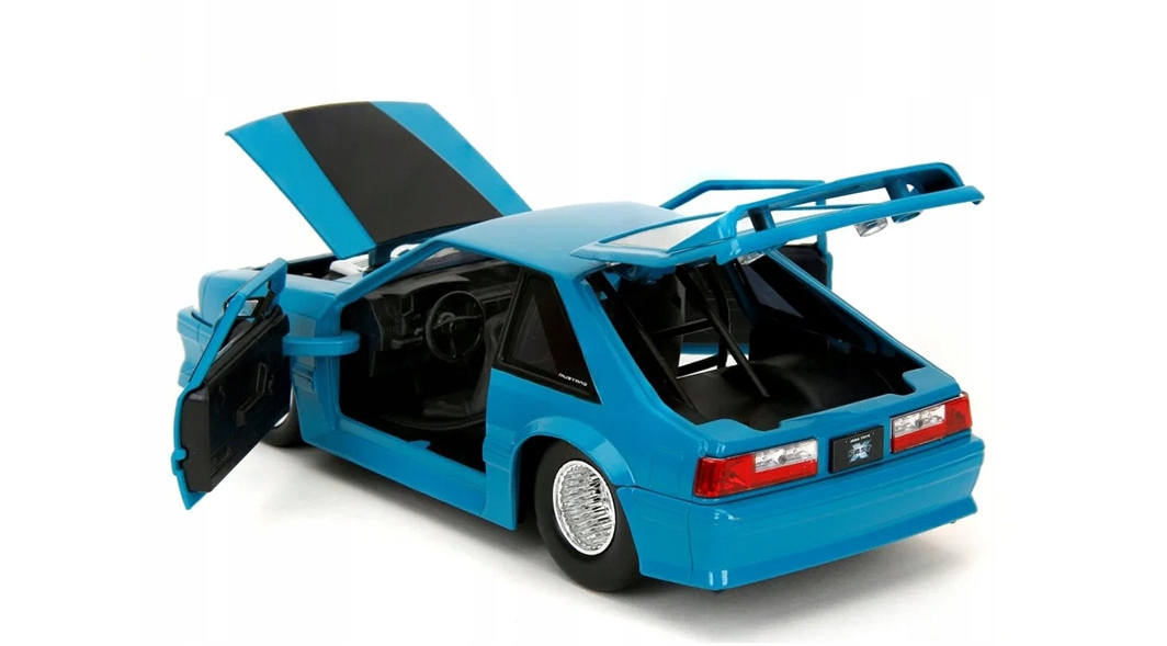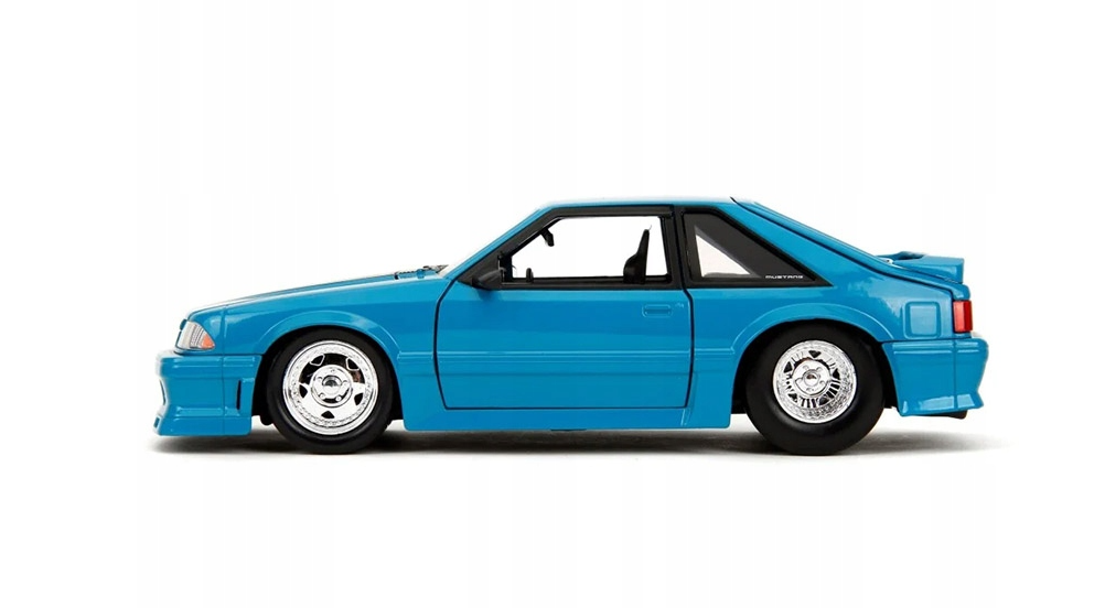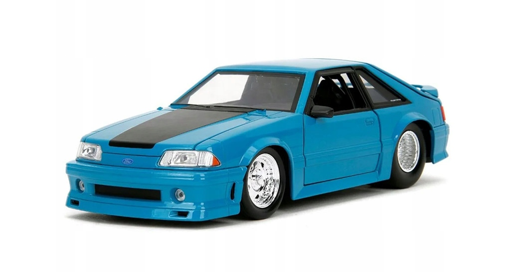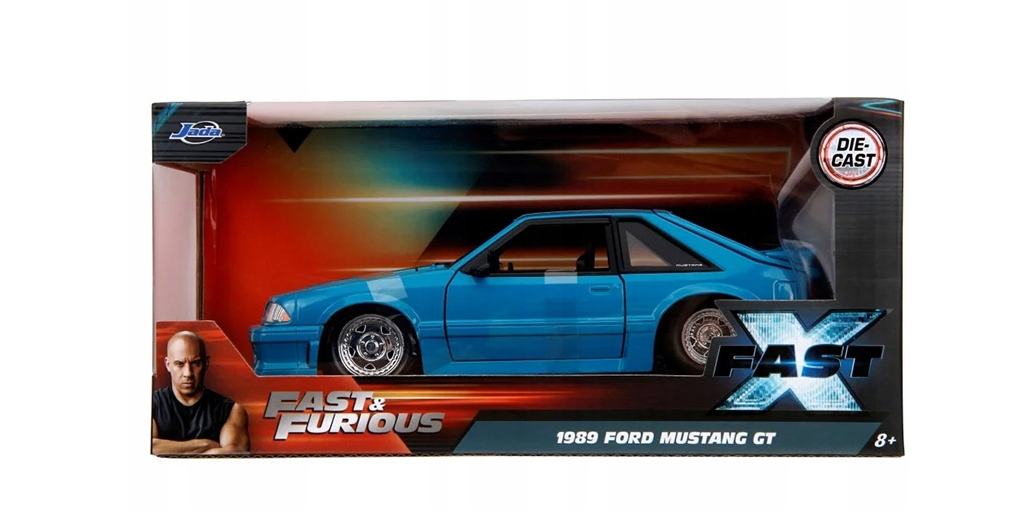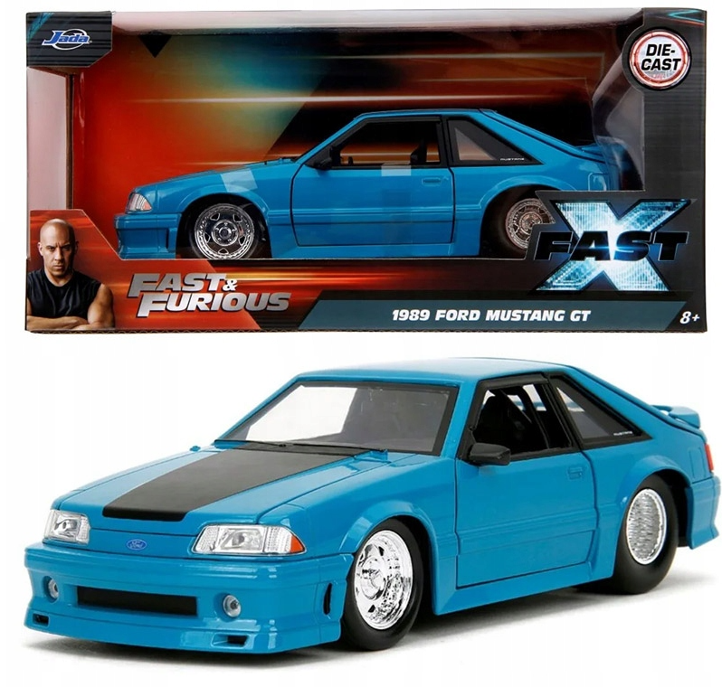 Model fantastycznego pojazdu marki Jada przedstawia 1989 Ford Mustang GT w intensywnym niebieskim kolorze. Pojazd znany jest oczywiście z serii Fast & Furious i stanowi nie lada gratkę dla wszystkich pasjonatów motoryzacji. Auto wykonano metodą odlewu ciśnieniowego z dbałością o szczegóły, w większości wykonane jest z metalu, w skali 1:24; ma otwierane drzwi, maskę oraz bagażnik, dodatkowo ma skrętne koła co stanowi dodatkową atrakcję i pozwala podziwiać idealnie dopracowane wnętrze pojazdu.
