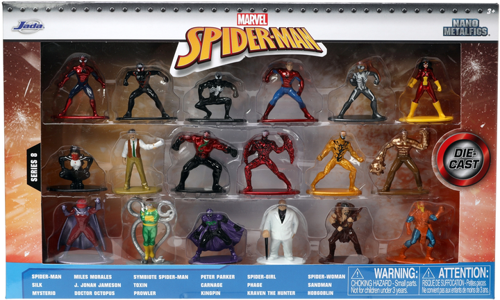 Zestaw firmy Jada zawiera aż 18 metalowych figurek z uwielbianego universum Marvela - Spiderman. Każda z figurek została wiernie odwzorowana, zachowując najdrobniejsze elementy. Postacie posiadają podstawki. Wysokość figurek to ok. 4 cm. W zestawie znajdziesz między innymi: Spider-Mana, Żelaznego Spidera, Żelazną Kobietę, Mysterio, Venoma i wielu innych bohaterów