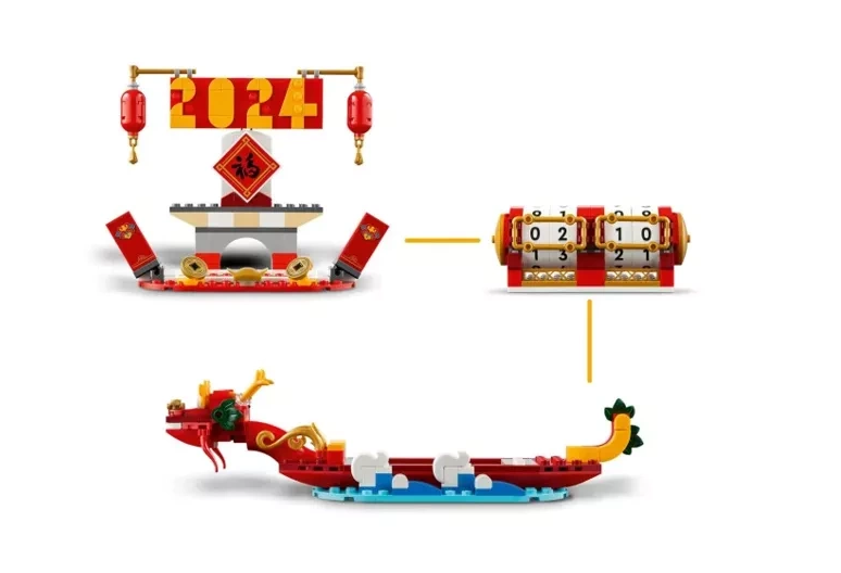 Kalendarz festiwalowy zbudowana z klocków LEGO® sprawi, że świętowanie stanie się jeszcze fajnieksze! Zestaw składający się z 345 elementów umożliwia zbudowanie dwóch różnych modeli, w zależności od tego czy świętujemy Nowy Rok Księżycowy, czy Święto Smoczych Łodzi. Model jest obrotowy, dzięki czemu można wybrać która data ma być widoczna. Dodatkowo w zestawie znajdują się minifigurki, lampiony, fajerwerki, czerwone koperty oraz symbol szczęścia.