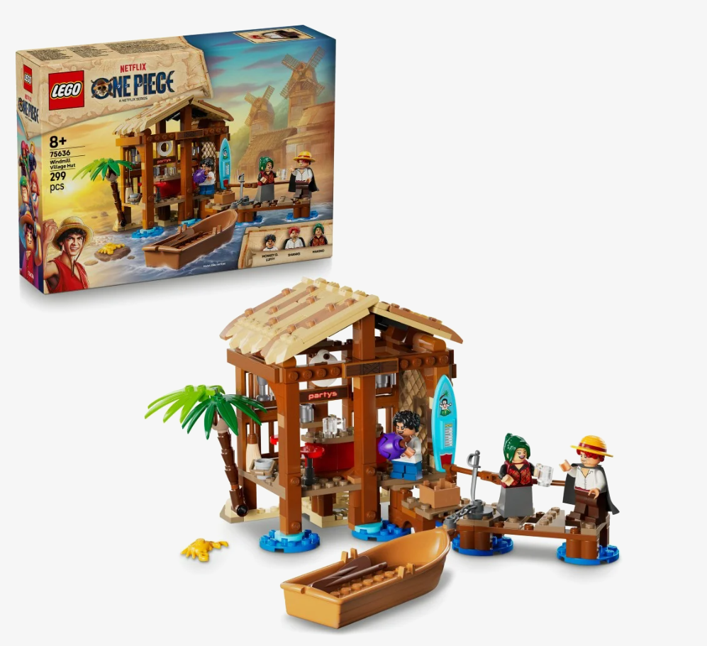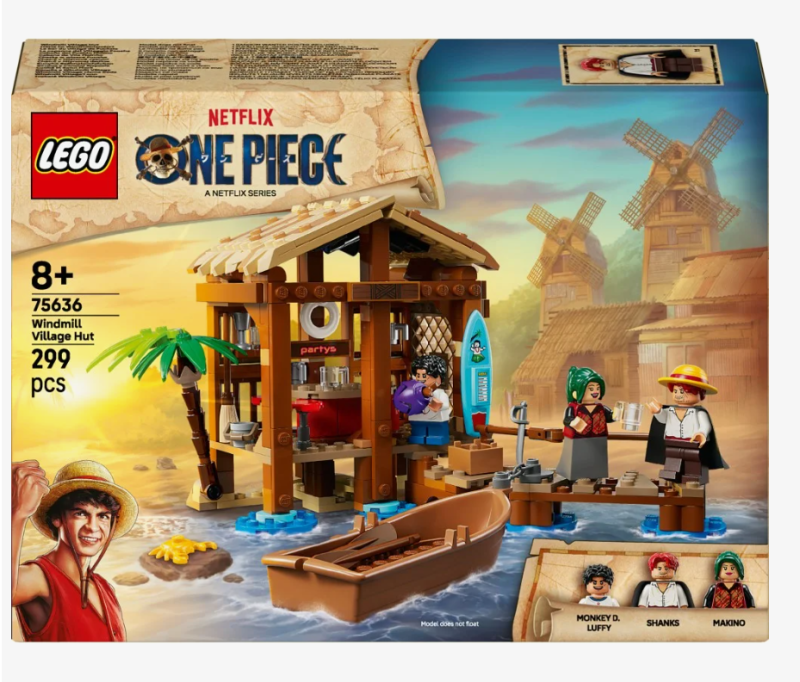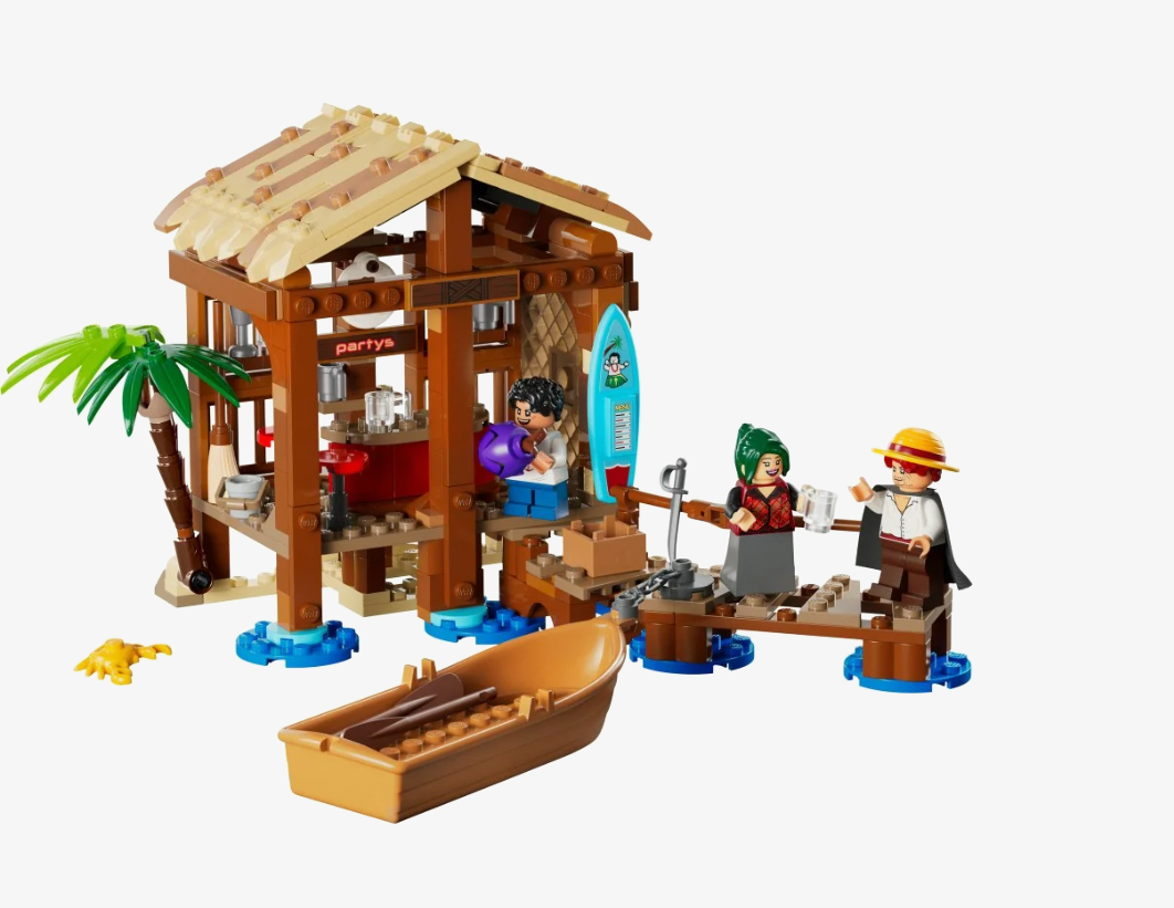 Na dzieci czeka szczegółowo odwzorowany sklepik Makino, położony tuż przy brzegu morza. Model został zaprojektowany z dbałością o szczegóły, zarówno na zewnątrz, jak i wewnątrz budynku, gdzie znajdziesz m.in. plakaty, skrzynki i wiele klimatycznych akcesoriów. Otwierany dach pozwala na łatwy dostęp do wnętrza, co sprawia, że zabawa staje się jeszcze bardziej angażująca. W zestawie znajdują się trzy minifigurki – Luffy, Shanks i Makino – dzięki którym możesz odtwarzać legendarne sceny z serialu lub tworzyć własne pirackie historie. Nie zabrakło też pomostu i zacumowanej łodzi, gotowej do wypłynięcia na nowe przygody.