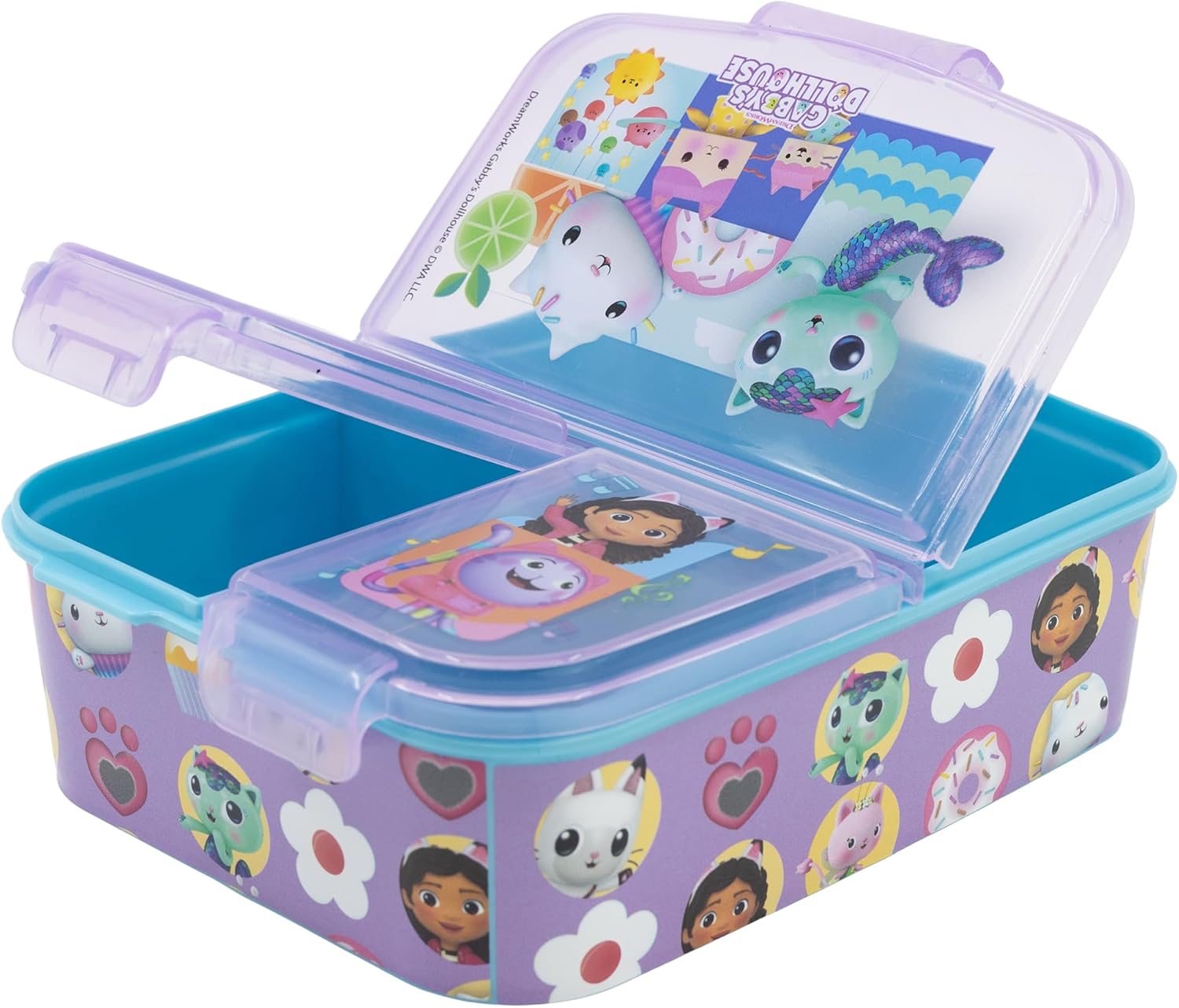 Pojemnik z trzema przegródkami to wygodne akcesorium, które umożliwi przechowywanie posiłków oraz przekąsek - z powodzeniem można zabrać go do szkoły, czy na wycieczkę. Trzy oddzielne komory mają również osobne przykrywki, co umożliwia oddzielenie poszczególnych części posiłku. Lunchbox jest wykonany z całkowicie bezpiecznych materiałów; pojemnik jest fioletowego koloru z nadrukami malutkich postaci bajki na całej powierzchni. Przykrywki są transparentne i mają nadrukowane wizerunki bohaterów: Gabi, Syrenkotki, Dj'a Kocimiętki, Wróżkici, Kiciusia Pandusia oraz Łakotka.