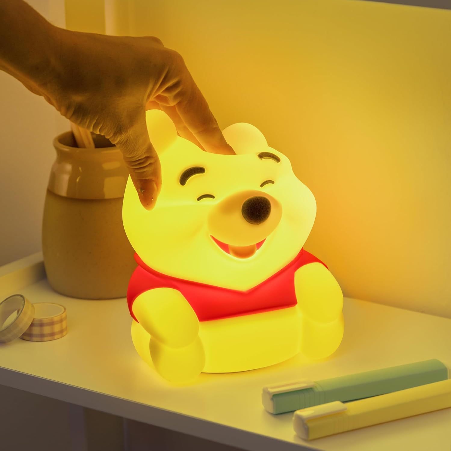 Silikonowa lampka to zabawny gadżet, który stanie się wspaniałym uzupełnieniem wyposażenia dziecięcego pokoju. Produkt ma 15 cm wysokości, a jego postać dokładnie oddaje wygląd kultowego niedźwiadka: jest żółtego koloru, ma czerwoną koszulkę i uśmiechnięty pyszczek. Działanie lampki aktywuje się, gdy jej dotkniemy, co doskonale sprawdza się u najmłodszych brzdąców podczas chociażby nocnych wybudzeń - maluchy mogą szybko zapalić lampkę. Lampka może dawać jednolite światło lub pulsować; ciekawym rozwiązaniem jest również tryb nocny, podczas którego lampka działa przez określoną ilość godzin, po czym samoczynnie się wyłącza.