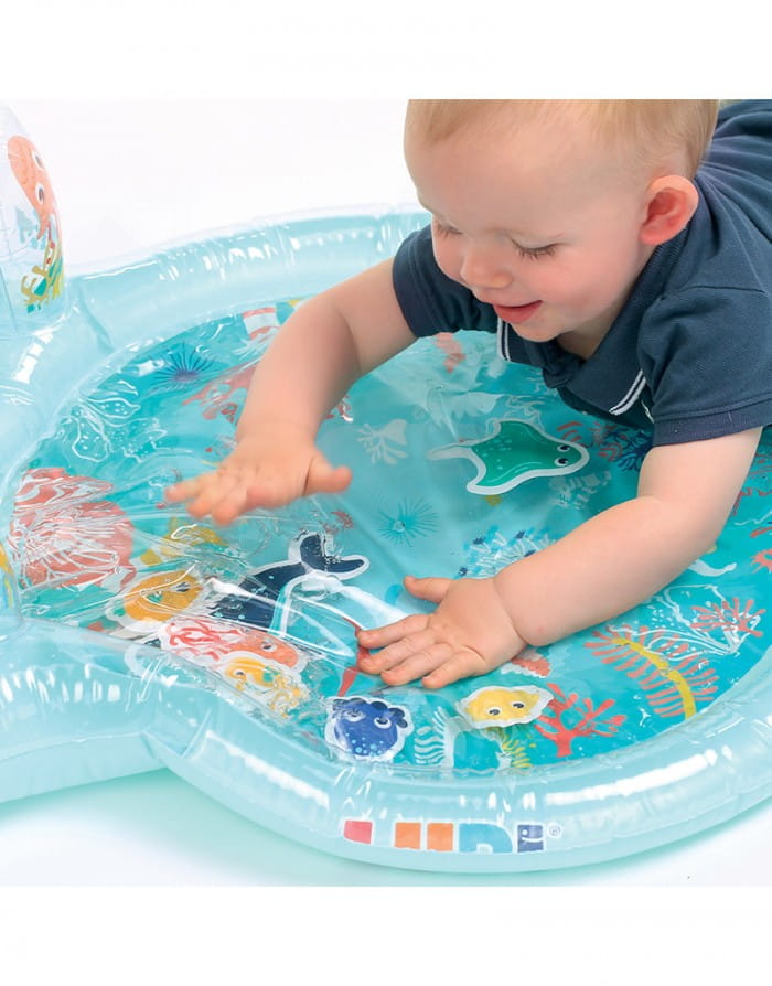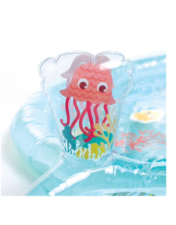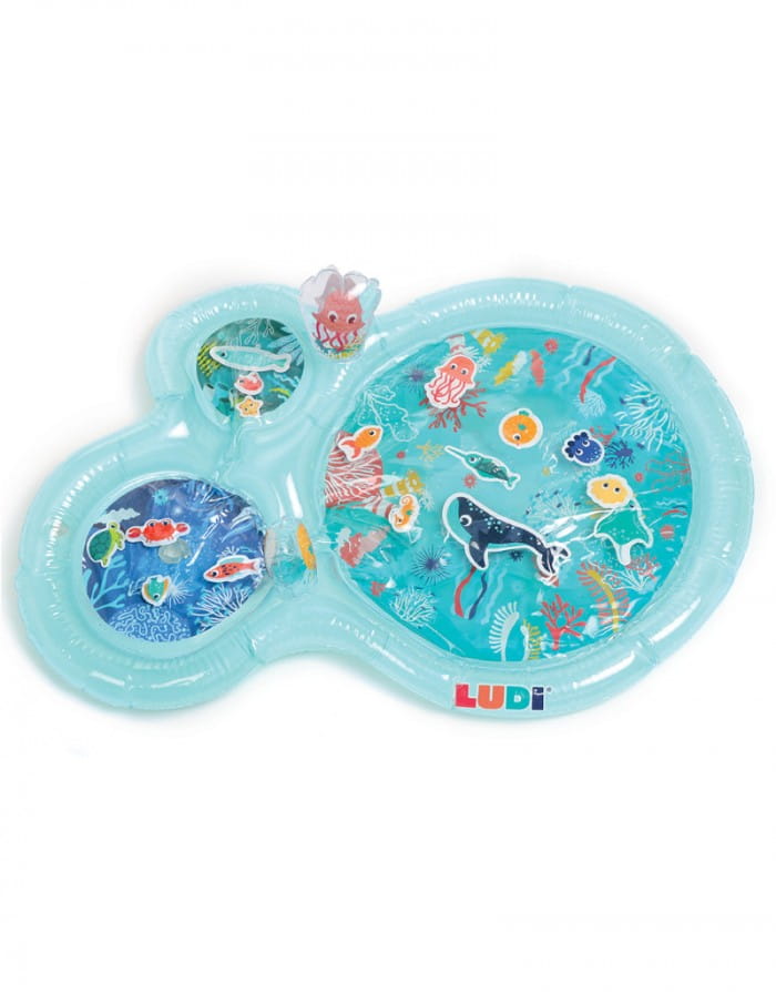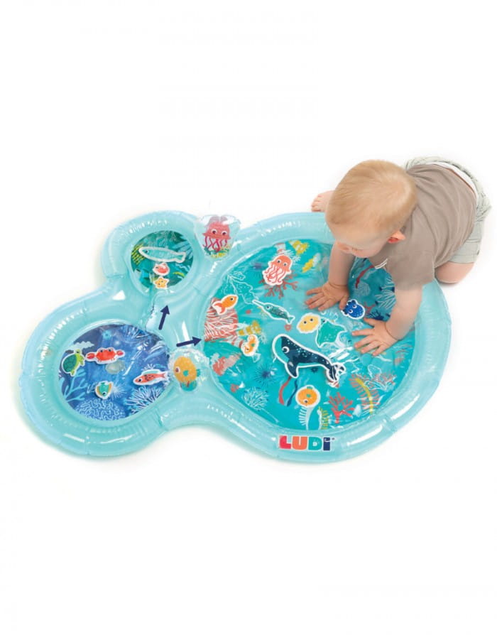 Maxi mata wodna od firmy Ludi to atrakcyjna zabawka, stworzona z myślą o rozwoju sensorycznym i motorycznym najmniejszych milusińskich. Poprzez zabawę matą, dzieci ćwiczą nie tylko aktywność fizyczną, ale także spostrzegawczość, zręczność, koordynację ruchową. Opierając się na macie maluszek wprawia w ruch wielobarwne morskie zwierzątka, może je przesuwać bądź łapać. Dodatkowo na powierzchni maty znajdują się dwa wystające elementy z efektami dźwiękowymi, które stymulują słuch dziecka. Na macie można się także zrelaksować , a nalewając chłodnej wody ochłodzić w upalny dzień.