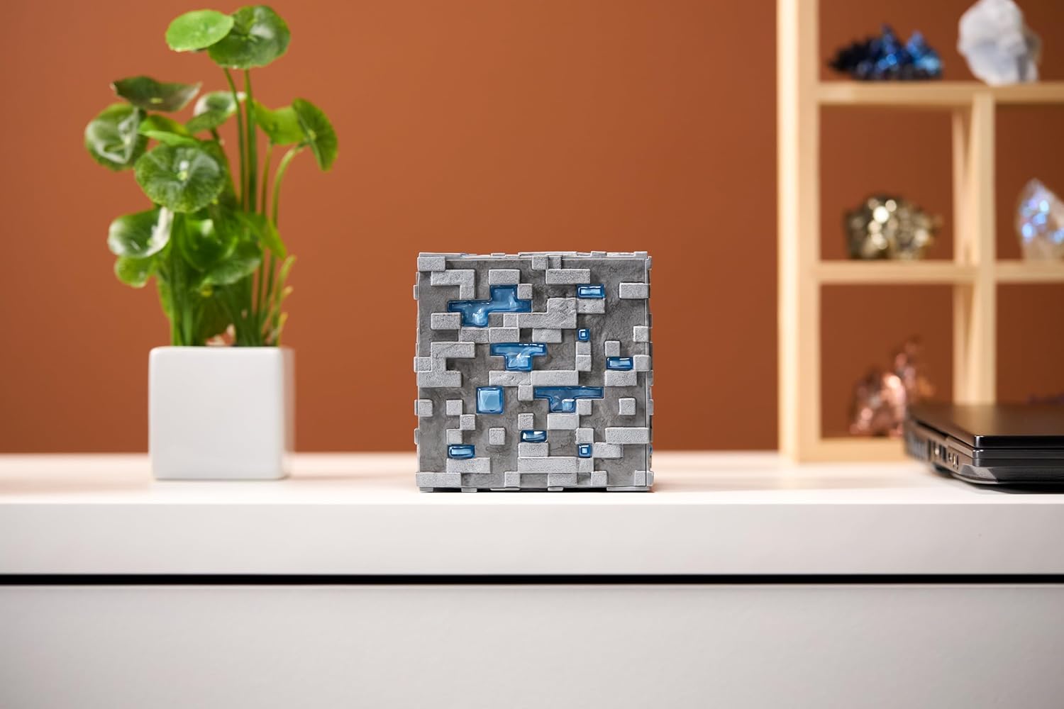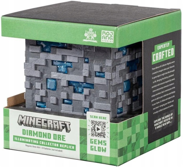 Lampka Minecraft w kształcie rudy diamentu z gry Minecraft stanie się idealną ozdobą pokoju każego fana wirtualnych potyczek. Wymiary lampki wynoszą 11 cm x 11 cm x 11 cm, a do poprawnego działania produktu wymagane jest użycie 3 baterii AAA (brak w zestawie). Produkt dedykowany jest dzieciom powyżej 8. roku życia.