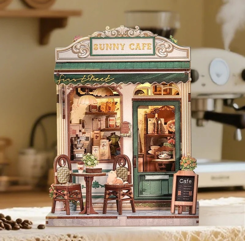 Zestaw do składania to idealna propozycja dla wszystkich miłośników prac plastycznych, które później cieszą oko i stanowią piękną ozdobę każdego pokoju. Sunny Cafe to kawiarnia zbudowana z 233 elementów - malutkie części wykonane są ze sklejki drewnianej, a sporą ich część łączy się przy użyciu kleju (brak w zestawie). Powstała konstrukcja ma wymiary 20 cm x 16 cm x 15,5 cm - widać tutaj pełne wyposażenie kafejki jak lada z akcesoriami, kawiarka, opakowania kaw ziarnistych czy stoliki dla klientów ozdobione pięknymi kwiatami. Trudność wykonania zestawu ocenia się jako 1/5 gwiazdek, a średni czas jego złożenia szacuje się na ok. 2-4 godziny. Oświetlenie LED działa na 2 baterie AAA (brak w zestawie).