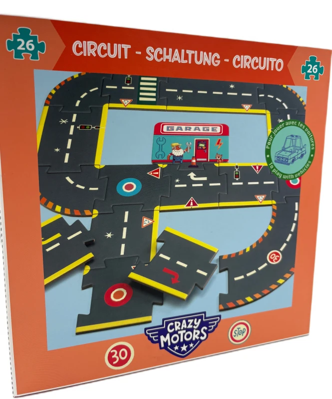 Po złożeniu puzzle stają się doskonałą planszą do zabawy samochodzikami z serii Crazy Motors.