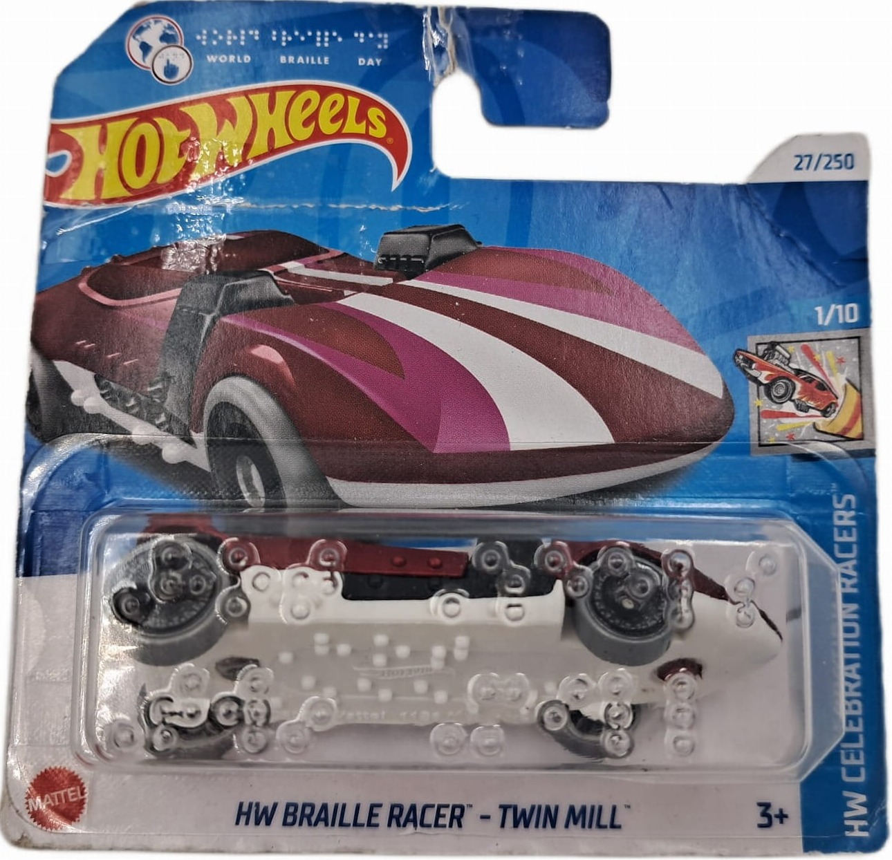 Nowe, fantastyczne autko do kolekcji, tak bardzo pożądane przez wszystkich miłośników Hot Wheels! Super szybkie, unikatowe, niezwykle funkcjonalne i stworzone do wyścigów akcji - właśnie tak prezentuje się wspaniały Braille Racer z karoserią w kolorze bordowym. Autko posiada napisy w języku Brailla, które są dedykowane osobom niewidomym. Autko wykonane jest z metalu z plastikowymi częściami i przeznaczone dla dzieci powyżej 3 roku życia.
