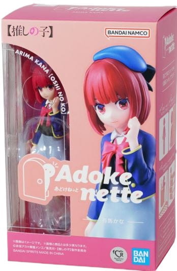 Figurka przedstawia Arima Kana, postać z popularnej serii anime "Oshi no Ko", w serii figurek Adokenette produkowanej przez firmę Bandai. Produkt przeznaczony dla dzieci powyżej 15 roku życia. Produkt został wykonany z PVC i ABS, co zapewnia trwałość i estetyczny wygląd. Dodatkowo w zestawie znajduje się podstawka, umożliwiająca stabilne wyeksponowanie figurki. Figurka mierzy 14 cm wysokości.