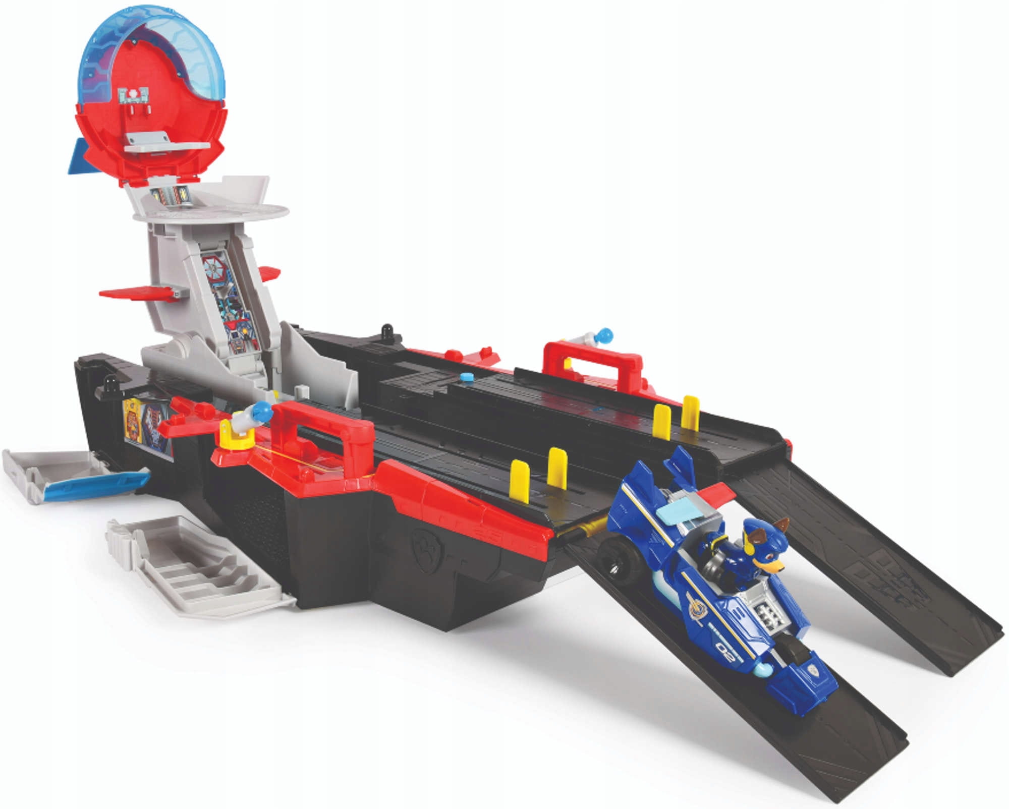 Siedziba lotniskowca to wyjątkowa propozycja zabawki, dla wszystkich fanów bohaterskiej psiej ekipy! Lotniskowiec może przekształcić się w prawdziwe centrum dowodzenia! Po naciśnięciu specjalnego guzika, lotniskowiec rozdziela się na dwie części, ukazując wnętrze podkładu, z meteorytem w roli głównej! Po naciśnięciu meteorytu generowane jest światło oraz dźwięk. Zestaw zawiera również pojazd Chase'a, który może rozpędzić się po rampie lotniskowca! Siedziba lotniskowca posiada również dwie wyrzutnie pocisków. Aby zabawa była jeszcze bardziej realistyczna, w zestawie znajduje się również figurka Chase'a!