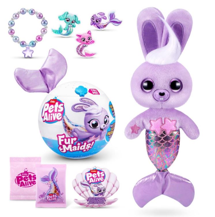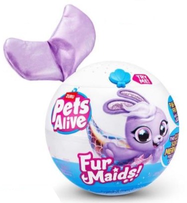 Poznaj najsłodsze maskotki syreny z serii Pets Alive Furmaids! Przedstawiamy Starlet, pełną wdzięku i kreatywności. Jej olśniewający ogon świeci niczym gwiazdy na nocnym niebie, a każdy jej ruch to czysta magia. Kocha występy, choreografie i tworzenie własnych melodii. Z nią każda zabawa zamienia się w podwodny koncert! Wciskając jej fioletową łapkę usłyszysz niesamowite dźwięki, a ogon zacznie się mienić niezwykłymi kolorami.