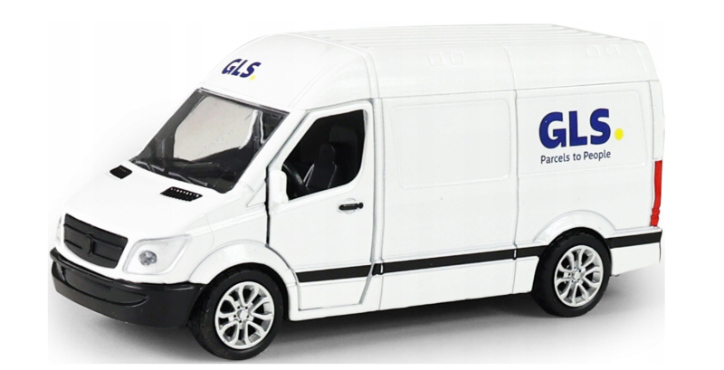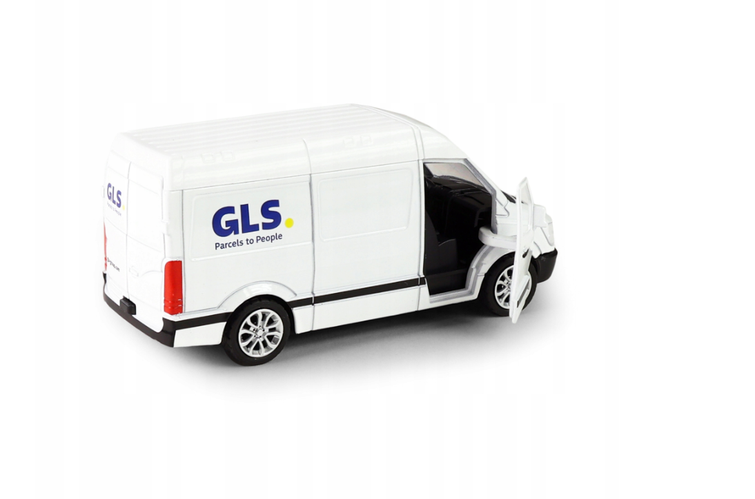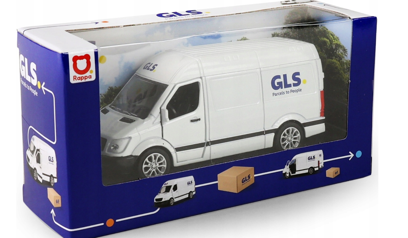 Model autka - samochodu kurierskiego GLS marki Rappa. Samochodzik jest wykonany z metalu, posiada białą karoserię z czarnymi elementami, otwierane przednie drzwi i napisy tematyczne. Jest doskonałym odwzorowaniem oryginału. Mierzy około 11 cm długości i 5 cm wysokości.