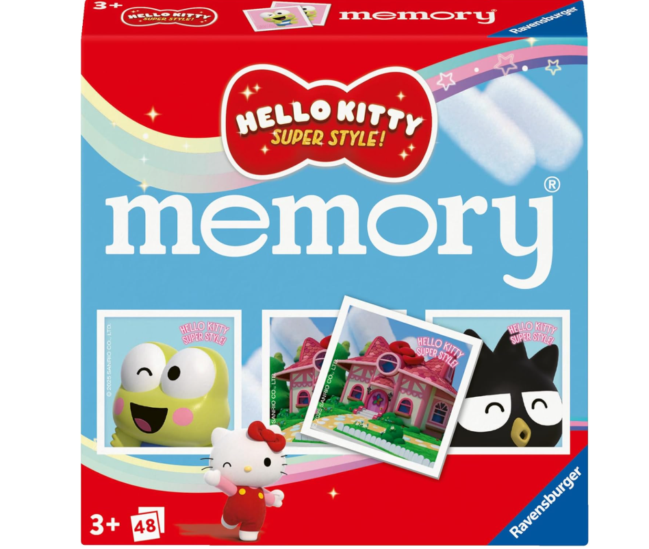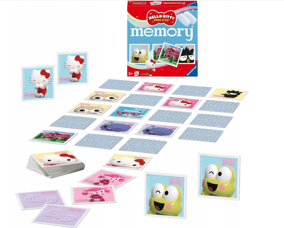 Gra memo marki Ravensburger składa się z 48 kart, a zadaniem graczy jest jak najszybsze wskazanie par takich samych kart, z tym że karty odwrócone są obrazkami ku dołowi. Dzieciaki muszą wykazać się więc sprytem, spostrzegawczością i doskonałą pamięcią! Na kartach znajdują się kolorowe obrazki, przedstawiające poszczególnych bohaterów z uwielbianej bajki Hello Kitty.