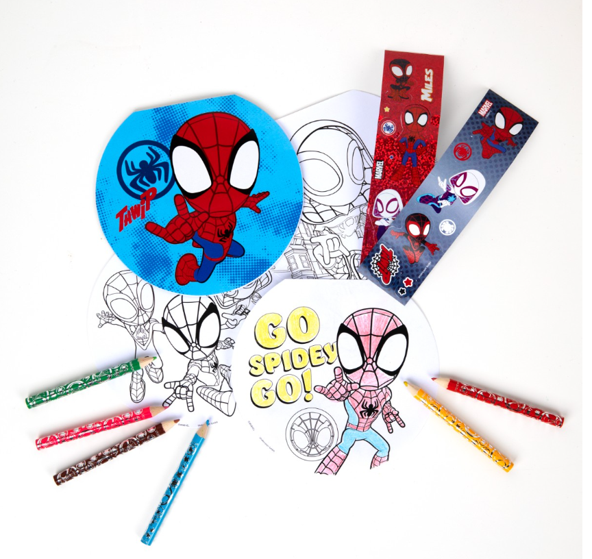 W zestawie znajduje się kolorowanka ze Spidey'em, 6 mini kredek, naklejki metaliczne i papierowe. Całość zamknięta jest w poręcznej przenośnej walizce, dzięki której dziecko może zabrać zestaw ze sobą gdzie tylko chce.