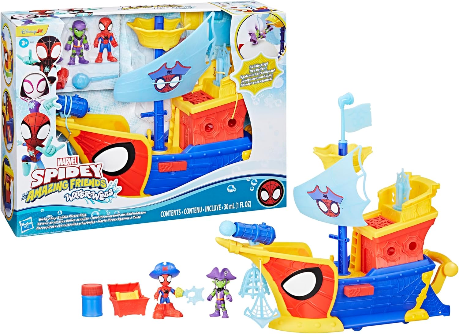 Zestaw do zabawy ze Spideyem z motywem piratów z pewnością zachwyci każdego małego fana serialu Spidey i super-kumple! Ten interaktywny zestaw łączy w sobie elementy przygody, kreatywności i wyobraźni, zapewniając godziny wspaniałej zabawy. Zawartość obejmuje figurki SpiderMana oraz Zielonego Goblina, statek piracki o maksymalnej długości 53 cm (statek można rozsunąć), dzięki czemu wewnątrz można przechowywać różne akcesoria. Zestaw umożliwia na interaktywną zabawę, gdyż statek posiada kilka dodatkowych funkcji, w tym produkcja baniek mydlanych!