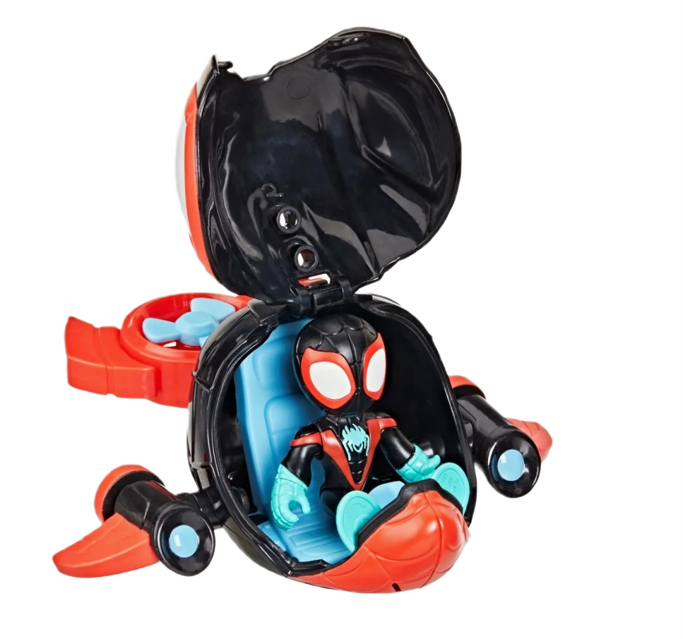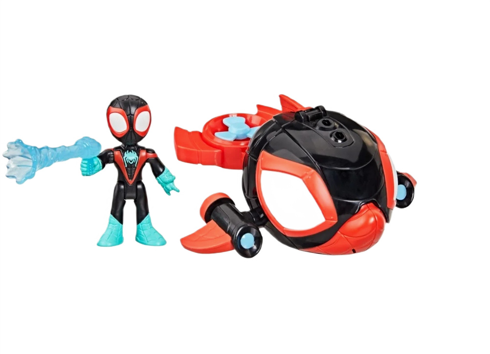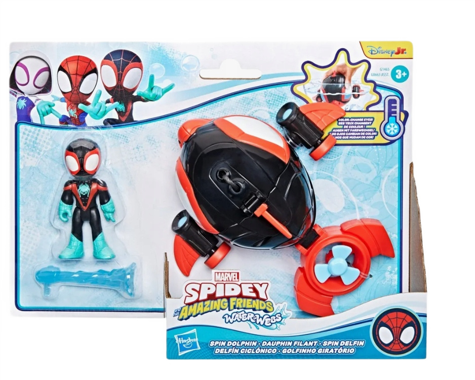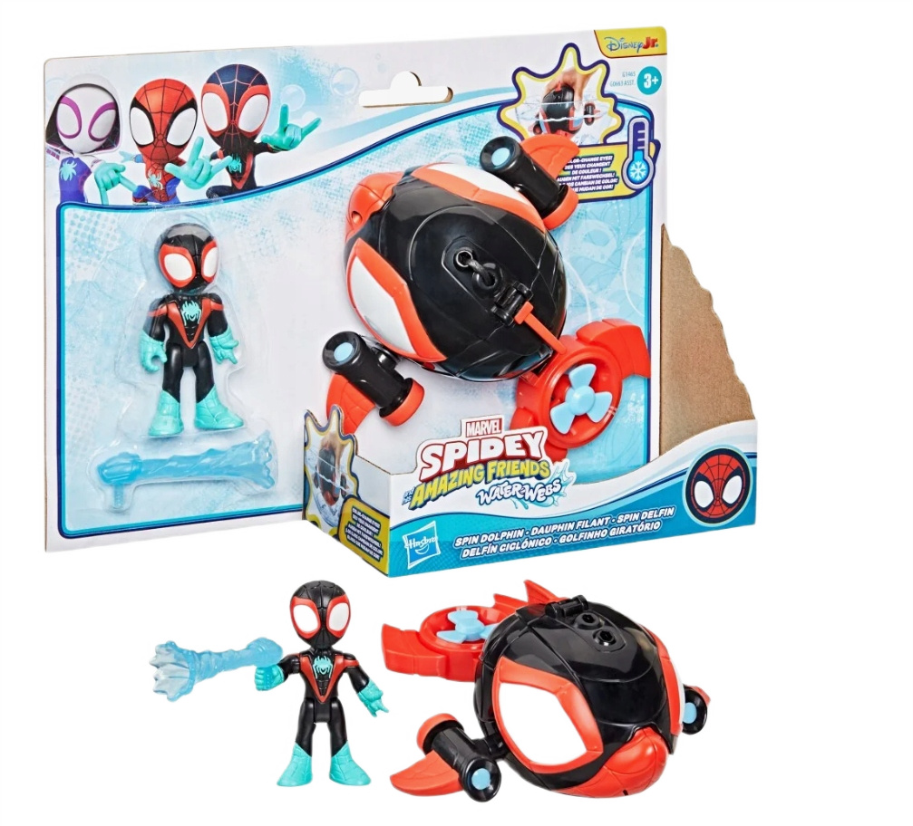 Zaprojektowana w dynamicznym stylu, łódź Spin Delfin wyróżnia się unikalną funkcją zmiany koloru oczu – wystarczy zanurzyć ją w zimnej wodzie, a jej oczy przemienią się z białych na intensywnie niebieskie, dodając zabawie element niespodzianki i magii. W zestawie znajduje się również figurka Milesa, która jest ruchoma i może usiąść wewnątrz pojazdu, a jej odczepiany pajęczy gadżet pozwala na jeszcze więcej kreatywnej rozgrywki.