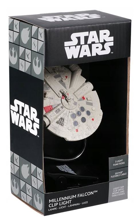 Lampka z klipsem - Sokół Millennium to idealny pomysł na prezent dla wszystkich fanów Gwiezdnych Wojen. Ma 3 tryby działania i ruchomy przewód długości 20 cm. Lampka działa na 3 baterie AAA (brak w zestawie).
