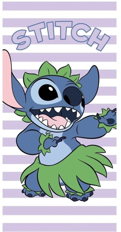Ręcznik plażowy doskonale sprawdzi się zarówno podczas relaksu na plaży, jak i podczas wyprawy na basen. Ręcznik ma biało-fioletowe pasy oraz duży nadruk tańczącego Stitcha, który ma na sobie zieloną spódniczkę! Czas dołączyć do zabawy!
