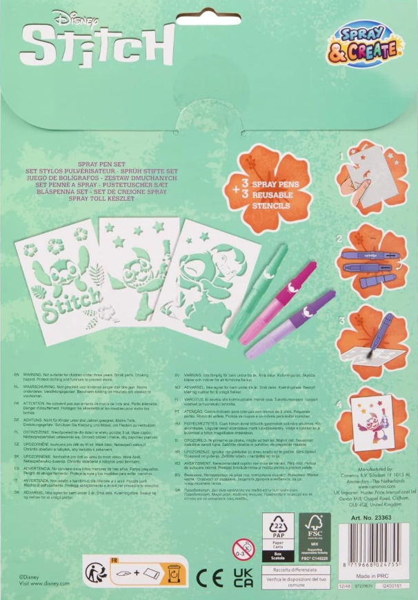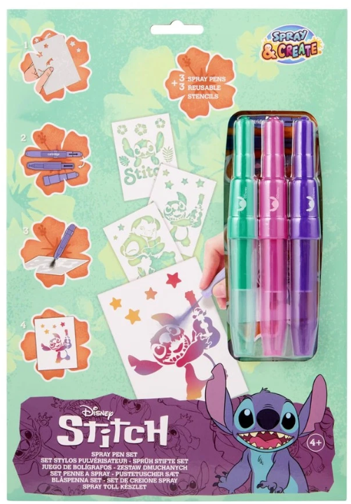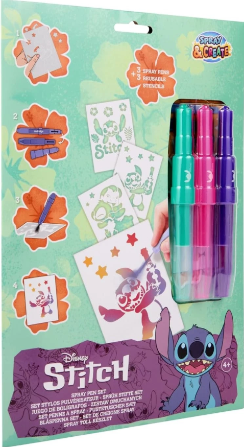 Zestaw SprayPen to niesamowicie kreatywna zabawa. W pudełku znajdziemy 3 szablony inspirowane bajką Lilo & Stitch oraz 3 pisaki w różnych kolorach. Ilustracje tworzy się dmuchając w pisaki. Dzięki temu uzyskujemy efekt sprayu, a obrazki stworzone taką metodą wyglądają jeszcze bardziej oryginalnie.