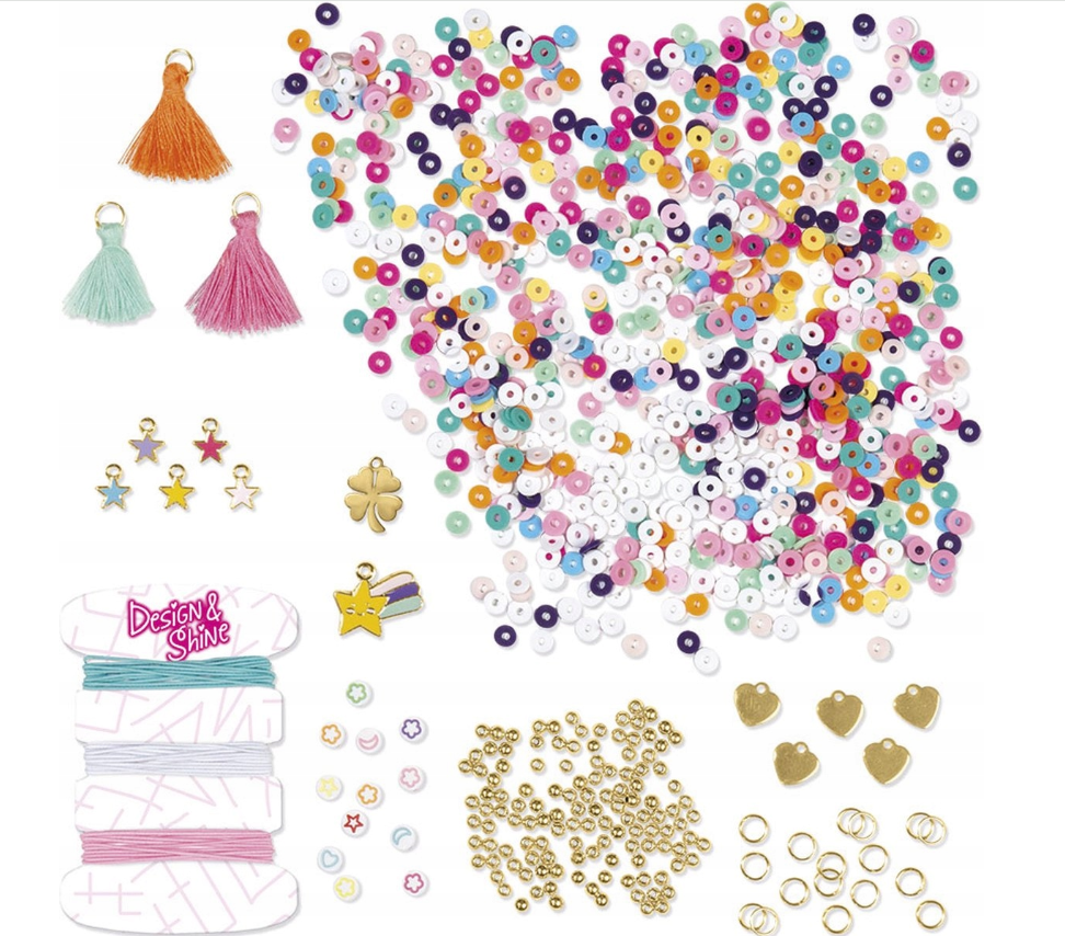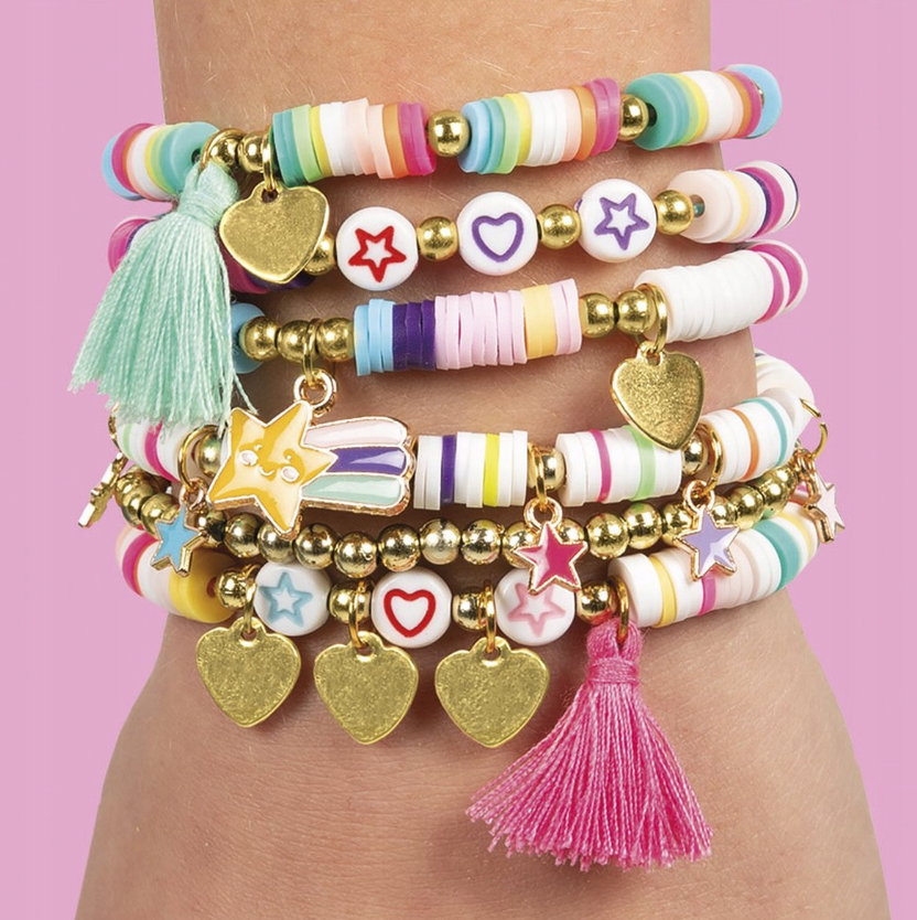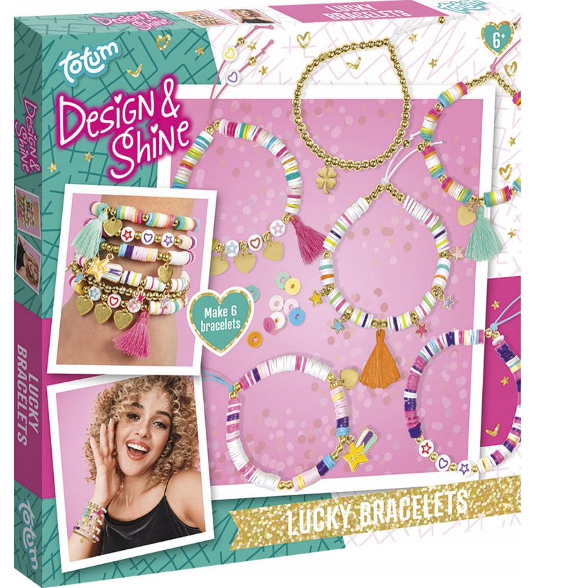 Zestaw do robienia bransoletek marki Totum to wspaniała propozycja dla małych, kreatywnych elegantek, które mogą samodzielnie wykonać przepiękne ozdoby. Dzięki temu zestawowi Lucky Bracelets dzieci mogą samodzielnie wykonać 6 modnych bransoletek, używając płaskich koralików w kształcie dysku / heishi, koralików i charmsów w kolorze złotym, koralików z nadrukiem, charmsów w kształcie serca i gwiazdy, frędzli, gumek i wielu innych.