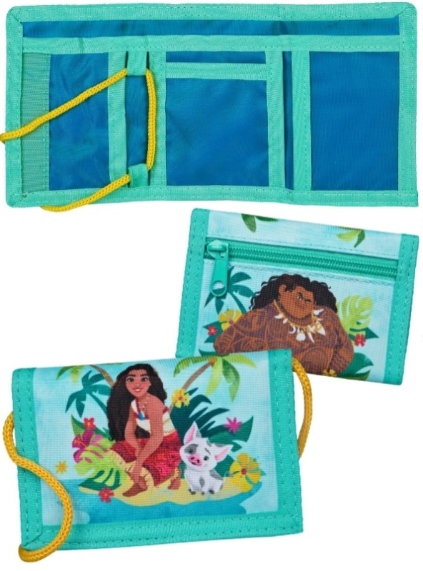 Portfel dla wszystkich fanów dzielnej Vaiany! Prostokątny portfel w miętowym kolorze doskonale sprawdzi się jako prezent dla każdego fana tej serii. Na przedniej stronie znajduje się grafika przedstawiająca Vaianę, na tylnej znajduje się wizerunek Maui'ego. Portfel jest składany i zamykany na rzepę. Środek portfela skrywa kilka osobnych kieszeni oraz dodatkową kieszeń zamykaną na zamek w tylnej części portfela. Dodatkowo do portfela został dołączony sznurek, dzięki któremu noszenie portfela będzie jeszcze łatwiejsze.