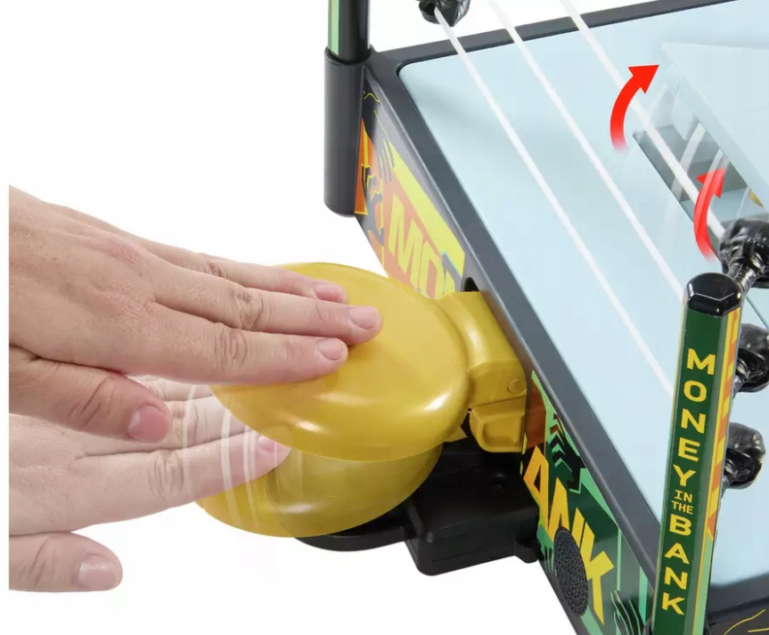 W trybie Money In The Bank możesz wystrzeliwać swoje figurki WWE (sprzedawane osobno) prosto w zawieszoną nad ringiem teczkę, natomiast w trybie Kick-Out sprawdzisz, kto zdoła uwolnić się z opresji i powrócić do akcji. Ponad 40 dźwięków i fraz nadaje zabawie wyjątkowy klimat, przenosząc graczy w sam środek emocjonującego show rodem z prawdziwego Money In The Bank.