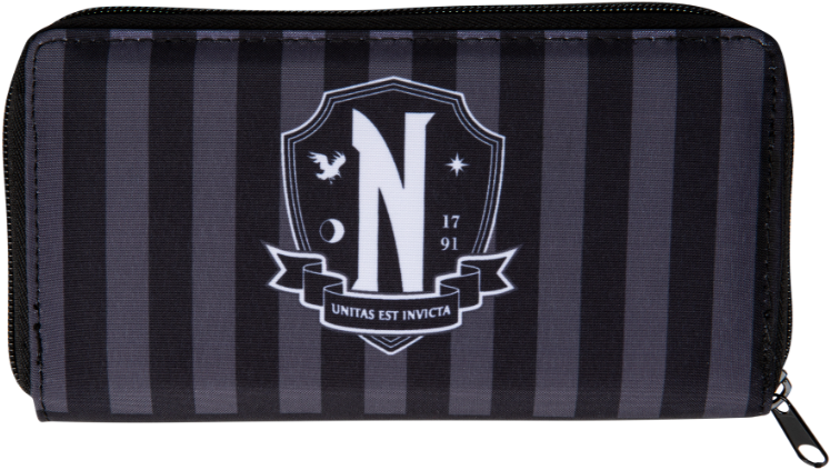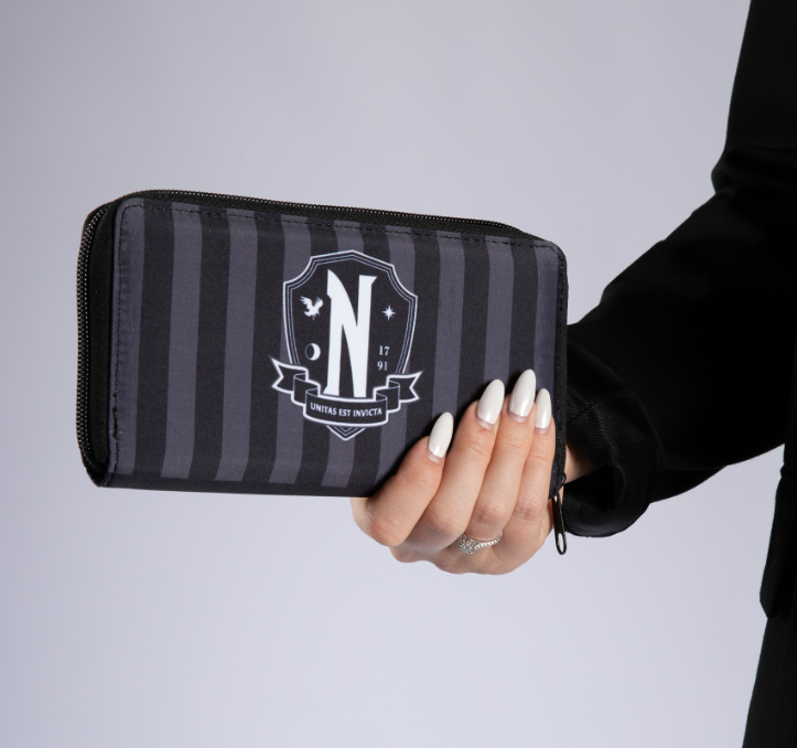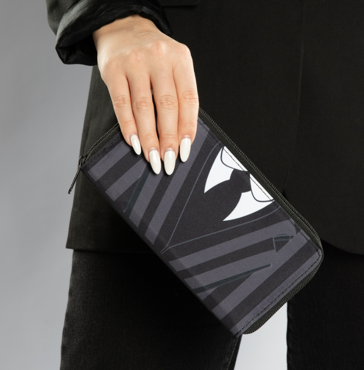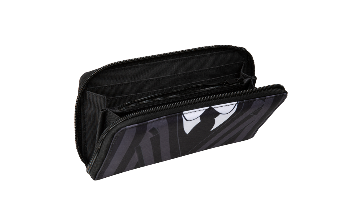 Portfel inspirowany serialem Wednesday stanie się doskonałym akcesorium dla każdej fanki serii. Portfel wyposażony jest w 3 przegródki. Kieszeń na monety zapinana na zamek znajduje się w środkowej części portfela. Dwie dodatkowe przegrody zapewniają łatwy dostęp do banknotów i kart. Zapięcie na zamek błyskawiczny na całej długości portfela gwarantuje bezpieczeństwo zawartości i zapobiega jej zgubieniu.