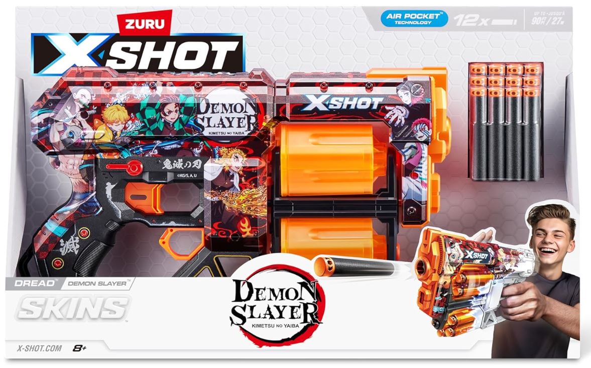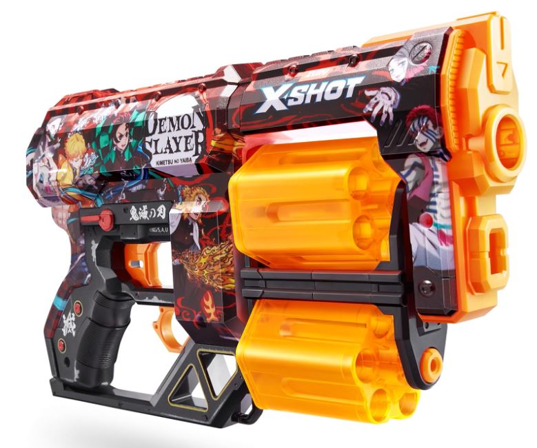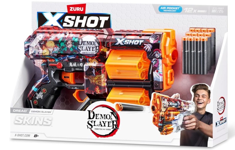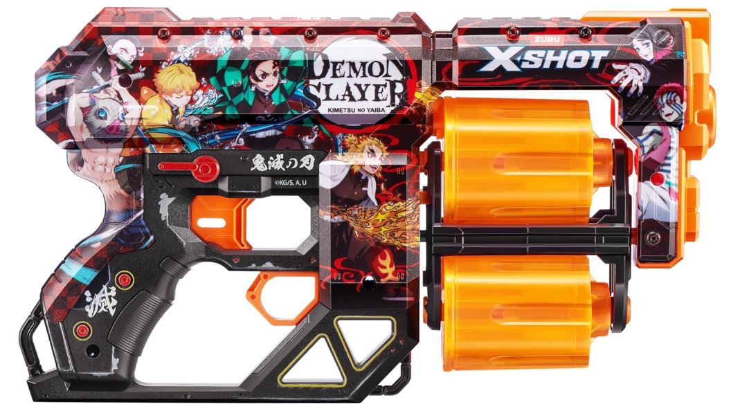 Fascynująca zabawa pistoletem z błyskawiczną prędkością Demon Slayer już czeka! Pojemność na 12 strzałek, podwójne obrotowe komory XSHOT Skins Dread gwarantują zwycięstwo w pojedynku z każdym wrogiem! Gdy skończą się strzały w jednej komorze, przełącz się na drugą i wystrzelaj w przeciwnika! Grafiki znajdujące się na pistolecie przypadną do gustu każdemu fanowi Demon Slayer.