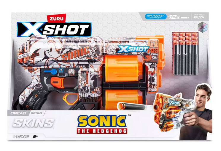 Fascynująca zabawa pistoletem z błyskawiczną prędkością Sonic the Hedgehog już czeka! Pojemność na 12 strzałek, podwójne obrotowe komory XSHOT Skins Dread gwarantują zwycięstwo w pojedynku z każdym wrogiem! Gdy skończą się strzały w jednej komorze, przełącz się na drugą i wystrzelaj w przeciwnika! Szukaj wszystkich 6 wzorów Sonic the Hedgehog i odkryj rzadkie wersje pistoletów. Grafika znajdująca się na pistolecie przypadną do gustu każdemu fanowi super szybkiego jeża Sonic!