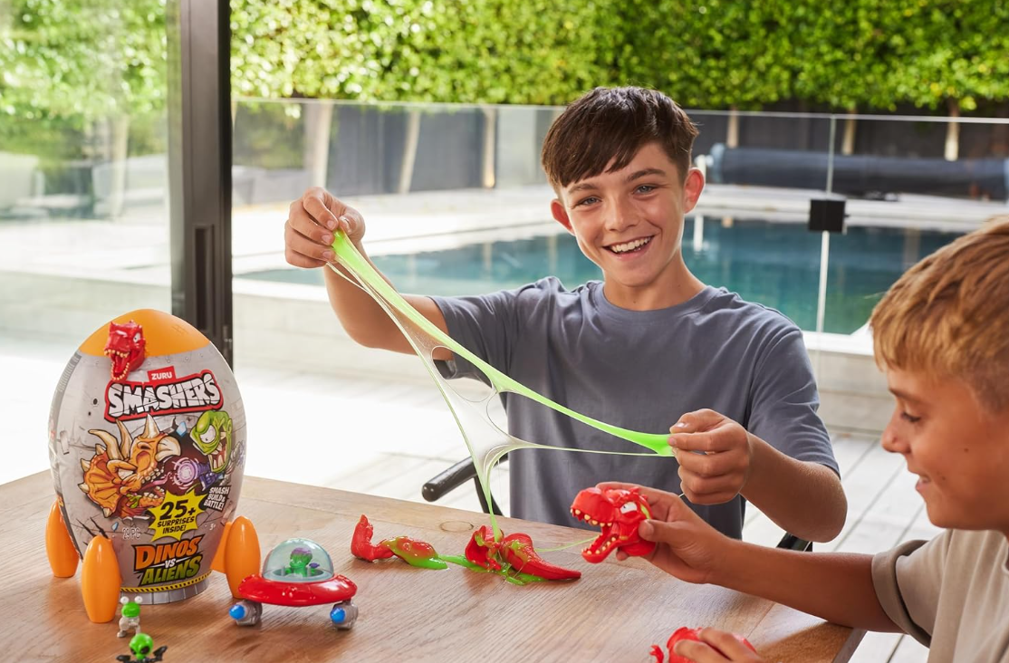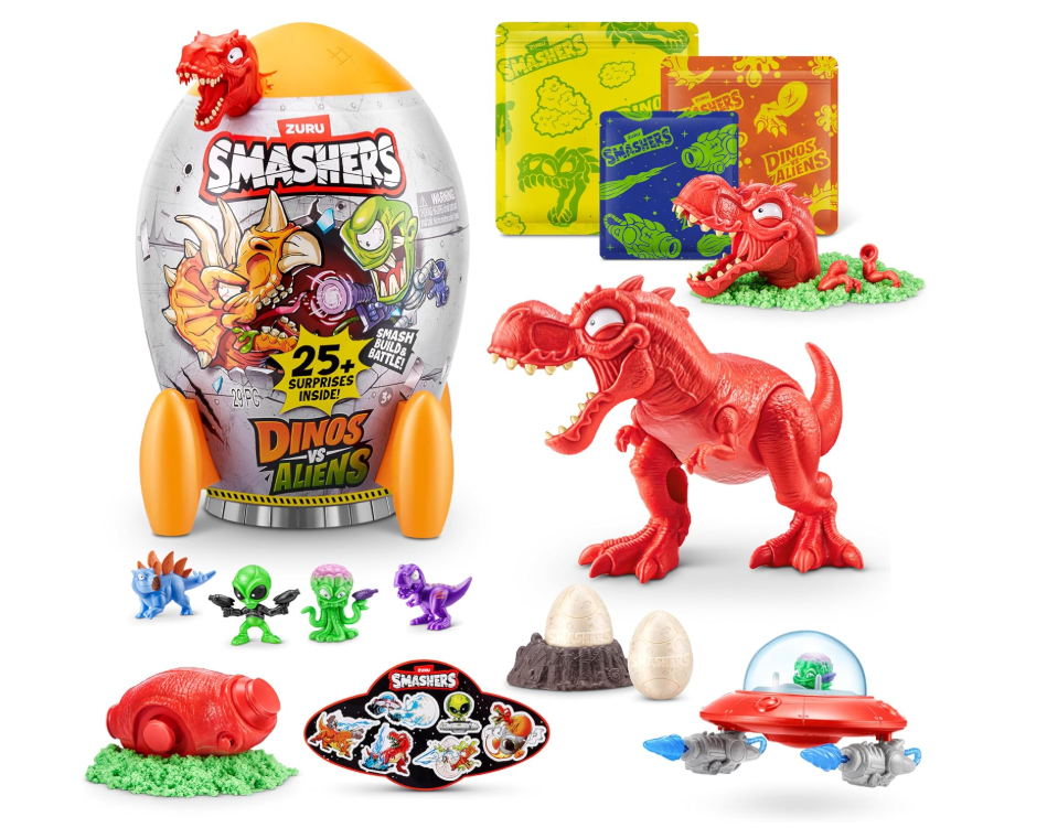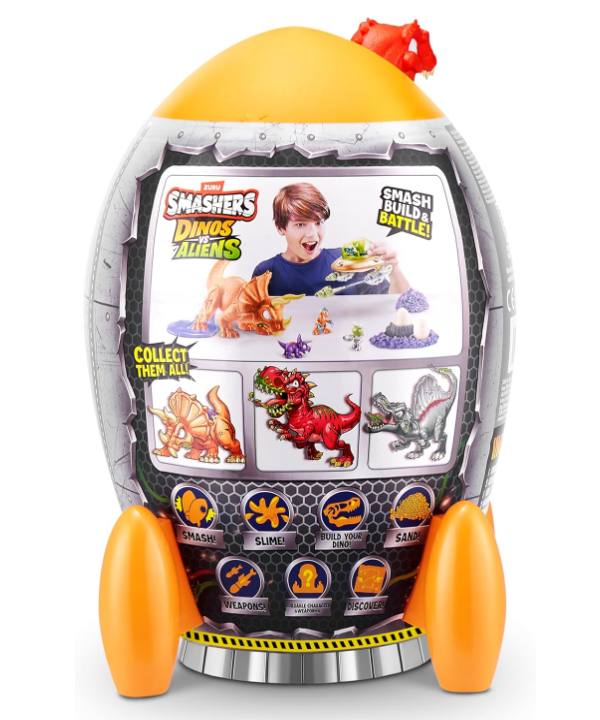 Przygotuj się na epicką bitwę między dinozaurami a kosmitami z nowym zestawem Smashers Dino vs Aliens Medium od Zuru. Niesamowita figurka dinozaura nie tylko zachwyca szczegółowym wykonaniem, ale również świeci w ciemności!. Rozbij jajo niespodziankę i odnajdź 25 niespodzianek, wśród których znajdziesz slime, kosmitów, kości do złożenia, i wiele akcesoriów do kreatywnej zabawy.