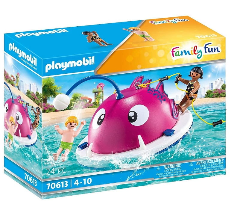 Zestaw klocków Playmobil Family Fun składa się z 24 klocków, wśród których znajdują się dwie figurki dzieci. Powstała wyspa może naprawdę unosić się na wodzie, stając się ciekawym akcesorium do zabawy podczas codziennych kąpieli. Zestaw posłuży zarówno podczas samodzielnej zabawy, jak również jako uzupełnienie innych zestawów klocków Playmobil.