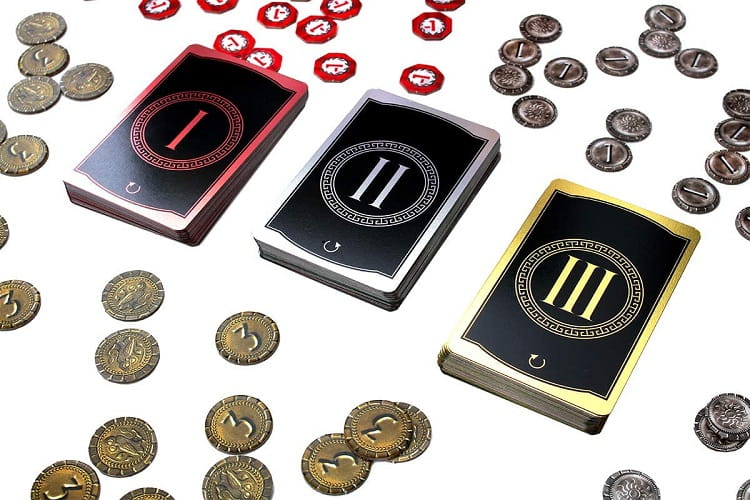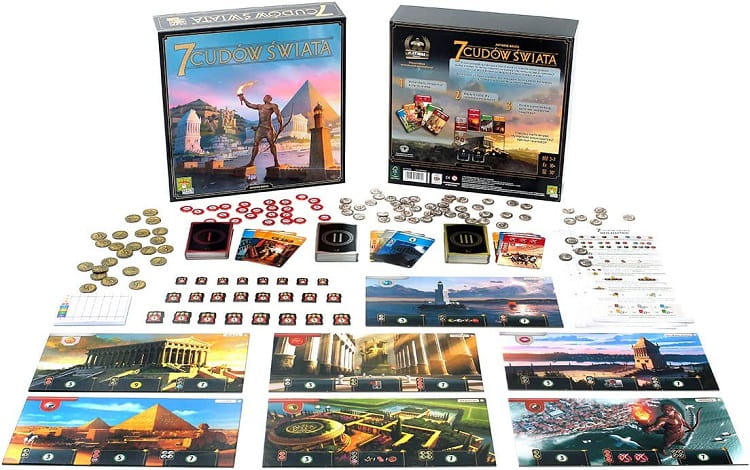 Opakowanie skrywa: 7 plansz Cudów, 148 kart, 48 żetonów Konfliktów, 78 monet, notes punktacji, 3 arkusze z opisami efektów, arkusz ze spisem kart i siatką powiązań oraz szczegółową instrukcję.