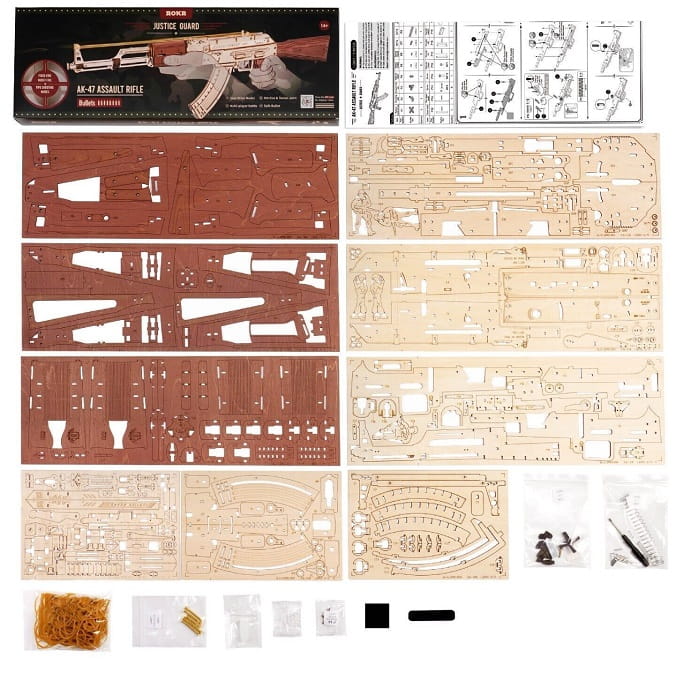 Zestaw DIY umożliwia samodzielne złożenie modelu broni AK-47 Assault Riffle. Powstała konstrukcja jest niebywale realistyczna i szczegółowa, a dzięki mechanizmowi połączonemu gumkami, z pistoletu można naprawdę strzelać, korzystając z papierowych nabojów. Model po złożeniu ma ok. 60 cm długości i w całości składa się z niewielkich, drewnianych elementów w dwóch odcieniach, jasnym i ciemnym.