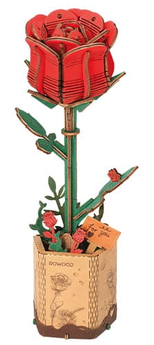 Model przestrzenny od Robotime umożliwia samodzielne złożenie przepięknej, czerwonej róży, która będzie mogła ozdobić dosłownie każde pomieszczenie. Powstała konstrukcja prezentuje się bardzo realistycznie - czerwony kwiat umieszczony jest w niewielkiej doniczce, ma zieloną łodygę z listkami, a na samym jej szczycie siedzi malutki motylek. Wszystkie elementy stworzone są z drewnianej sklejki - ich połączenie i złożenie wymaga maksymalnego skupienia oraz zachowania precyzji. Gotowa kompozycja ma ok. 20 cm wysokości i składa się łącznie ze 108 elementów.