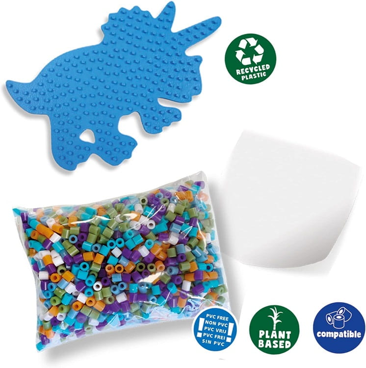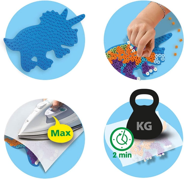 Zestaw jest w pełni kompletny i umożliwia samodzielne wykonanie kolorowych prasowanek z dinozaurami w roli głównej. Zestaw kreatywny dedykowany jest dzieciom powyżej 5. roku życia.