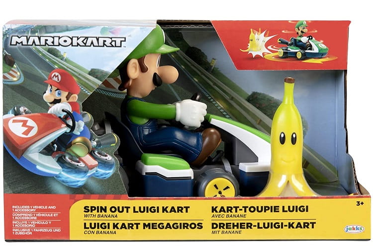 Pojazd, na którym porusza się Luigi, może przemieszczać się z zawrotną prędkością! Samochodzik jest szaro - zielonego koloru, a za jego sterami umieszczona jest figurki Luigiego, która wiernie oddaje wygląd wirtualnego bohatera popularnej gry komputerowej Super Mario. Do zestawu dołączono również skórkę od banana, jaka może szybko sprawić, że samochód zacznie obracać się dookoła własnej osi!