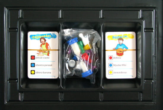 Tradycyjne kalambury w wersji familijnej. Na stole położymy planszę z kolorowymi znakami, ruletkę i dwa rodzaje kart - karty czynności i postaci. W zależności od koloru oczek na wyrzuconej kostce łączymy warianty pytań, czyli z karty postaci odpowiednio wybieramy bohatera (np. żyrafę), a z karty czynności analogicznie - czynność (np. czołga się). Zaskakujące połączenia to nie lada wyzwanie, ale także masa śmiechu! Wyobraź sobie myjącego zęby wampira czy czołgającą się żyrafę, a następnie spróbuj to przedstawić używając jedynie mowy ciała. Jakkolwiek śmieszna nie jest Twoja gra aktorska, to osoba zgadująca musi zachować powagę, bo inaczej cofa się o jedno pole na planszy.