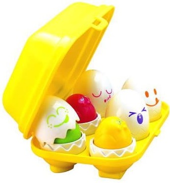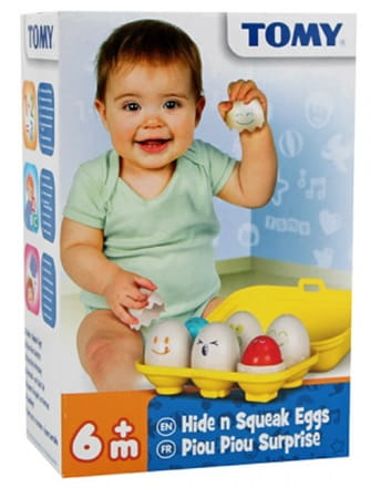 Jajeczka z dźwiękiem to zabawka, przy której Twoje dziecko spędzi wiele godzin. Każde jajeczko skrywa w sobie kurczaczka, który po naciśnięciu wydaje wesoły pisk. Dziecko nauczy się sortowania według kolorów, ponieważ musi dopasować kolor uśmiechu do koloru kurczaczka. Dodatkowo dziecko nauczy się sortowania według kształtów, ponieważ musi wsadzić jajko tak, aby spód jajka i kształt miejsca w wytłoczce do siebie pasowały.