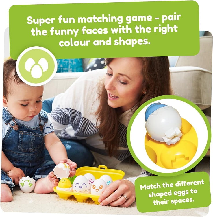 Jajeczka Tomy to zabawne akcesoria do zabawy, które wspierają rozwój motoryki i zręczności, ale też zapewniają wiele zabawy i uśmiechu na twarzach wszystkich brzdąców. Żółta wytłaczanka wygląda jak prawdziwy pojemnik na jajka i skrywa 6 sztuk jajeczek z nadrukami uśmiechów. Każde jajko można rozpołowić jak prawdziwą skorupkę, odkrywając kolorowe żółtka - całej zabawie towarzyszyć będą dźwięczne melodie. Poszczególne jajeczka można umieszczać w wytłaczance, łącząc właściwe kształty z podstawkami; maluchy mogą też dowolnie miksować skorupki - zabawa z pewnością będzie trwała bez końca!