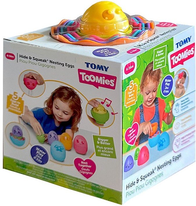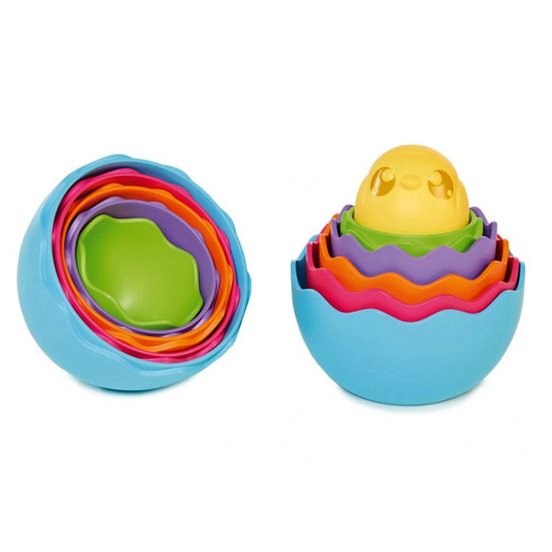 Zestaw składa się z 5 jajek oraz środka – pisklaka. Każda ze skorupek jest innego koloru i wielkości. Zabawka daje bobasowi kilka możliwości zabawy. Z jajeczek można korzystać w kąpieli – każde z nich posiada otwory, przez które będzie się przelewać nagromadzona wewnątrz woda. Maluch może spróbować swoich sił w ułożeniu jajeczek od najmniejszego do największego, ćwicząc przy tym koordynację dłoni oraz zdolność myślenia logicznego. Może również złożyć skorupki w całość, dopasowując je kolorystycznie, co rozwinie jego spostrzegawczość. Kiedy maluszek naciśnie żółtego kurczaczka, ten wyda zabawny dźwięk!