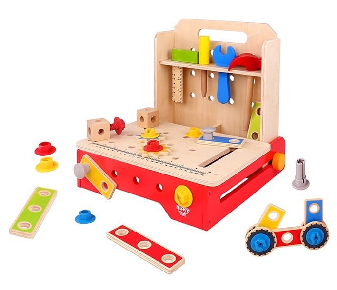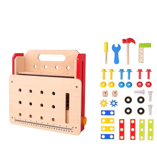 Zabawka drewniana typu warsztat z narzędziami to propozycja dla nieco starszych dzieci, bo powyżej trzeciego roku życia. Rozkładany stół warsztatowy do połączenie blatu z linijką i otworami na śrubki oraz półeczki na narzędzia. Całość stoi na czerwonej ramce, która również jest funkcjonalna. Proste, podstawowe narzędzia - młotek, wałek, klucz i kątownik są drewniane i zaprojektowane w taki sposób, by były w pełni bezpieczne dla małego majsterkowicza. Komplet zawiera także deseczki z otworami i śrubki, które można ze sobą skręcić. Za pomocą specjalnych części maluch połączy różne elementy, między innymi skręci kostki lub przykręci do blatu gwiazdki. Zabawa w majsterkowicza wpływa na rozwój umiejętności manualnych i koordynacyjnych dziecka, a także stymuluje wyobraźnię i kreatywność. W zestawie znajduje się łącznie 36 elementów. Stół warsztatowy można złożyć po skończonej zabawie, oszczędzając w ten sposób sporo miejsca.