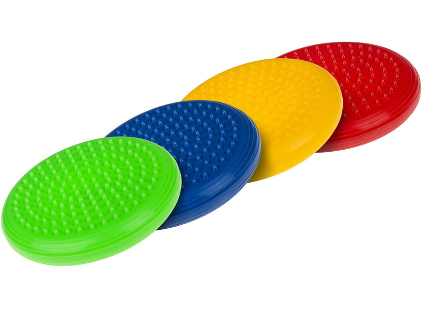 Dyski sensoryczne mogą służyć do zabawy, ćwiczeń lub rehabilitacji. Dyski wyprodukowano z wysokiej jakości materiału gumowego, wolnego od BPA, ftalanów i metali ciężkich. W zestawie znajdziemy cztery sztuki w kolorach: zielonym, czerwonym, niebieskim i żółtym. Powierzchnia dysków pokryta jest miękkimi, elastycznymi wypustkami - kolcami, które pobudzają receptory czuciowe i poprawiają krążenie krwi. Po dyskach można chodzić, biegać czy skakać. Wykorzystamy je do ćwiczenia równowagi, korekcji wad postawy czy do masażu stóp dziecka. Mają korzystny wpływ na rozwój integracji sensorycznej malucha - wspomagają odbiór informacji z receptorów czuciowych przez układ nerwowy. Dyski sensoryczne polecane są także w przypadku leczenia płaskostopia oraz koślawości kończyn dolnych u dzieci. Skutecznie zmniejszają napięcie mięśniowe. Zabawki zostały wyprodukowane w Polsce.