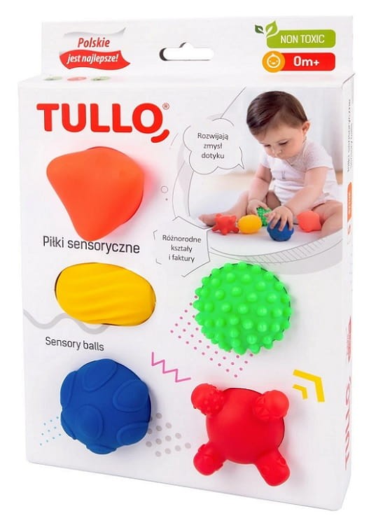 Zestaw pięciu piłek sensorycznych marki Tullo. Każda piłeczka ma nieco inny kształt i całkowicie odmienny kolor - wszystkie elementy zestawu umożliwiają rozwój zmysłów wzroku i dotyku. Piłeczki są miękkie i mogą posłużyć zarówno podczas klasycznej zabawy, jak również podczas harców w wodzie.
